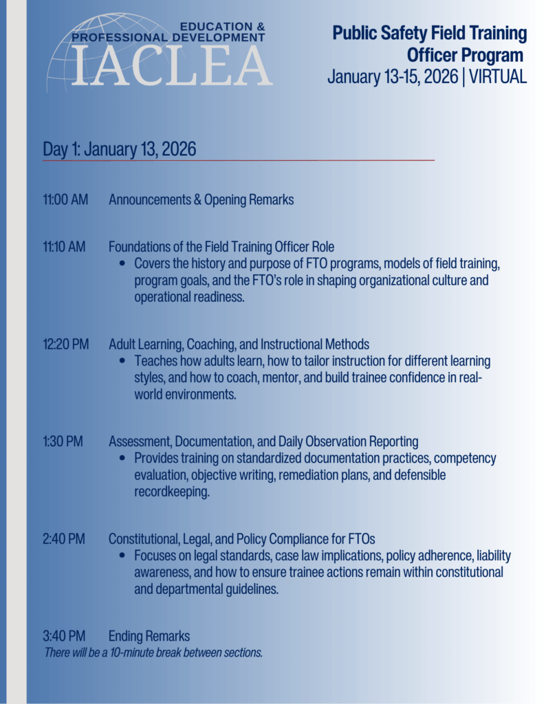 This course is designed to prepare experienced public safety personnel to serve as Field Training Officers (FTOs). Participants will learn the principles and best practices of training, coaching, and evaluating new recruits in real-world settings. Topics include adult learning strategies, effective communication, performance documentation, mentoring techniques, and managing common challenges faced during field training. The course emphasizes the dual role of the FTO as both trainer and role model, ensuring that new personnel develop the skills, judgment, and professionalism required for success. By the end of the course, learners will be equipped to foster competence, confidence, and accountability in the next generation of public safety professionals.