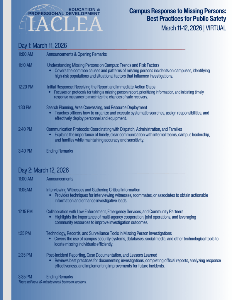 This course equips public safety professionals with the knowledge and skills to effectively respond to missing person incidents on campus. Participants will learn how to implement rapid response protocols, coordinate with local and federal law enforcement, and conduct thorough investigations while prioritizing the safety and well-being of the missing individual. Topics include evidence collection, interviewing techniques, communication strategies, and risk assessment. Learners will develop the ability to respond efficiently, make informed decisions, and enhance campus safety through effective missing person response procedures.