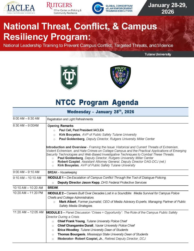 This training is designed to train both security/law enforcement personnel on college campuses with civilian administrative leadership based upon the unique challenges that both groups face, specific to the college environment. The program is designed to be interactive with the use of case studies, video work, and interactive exercises.