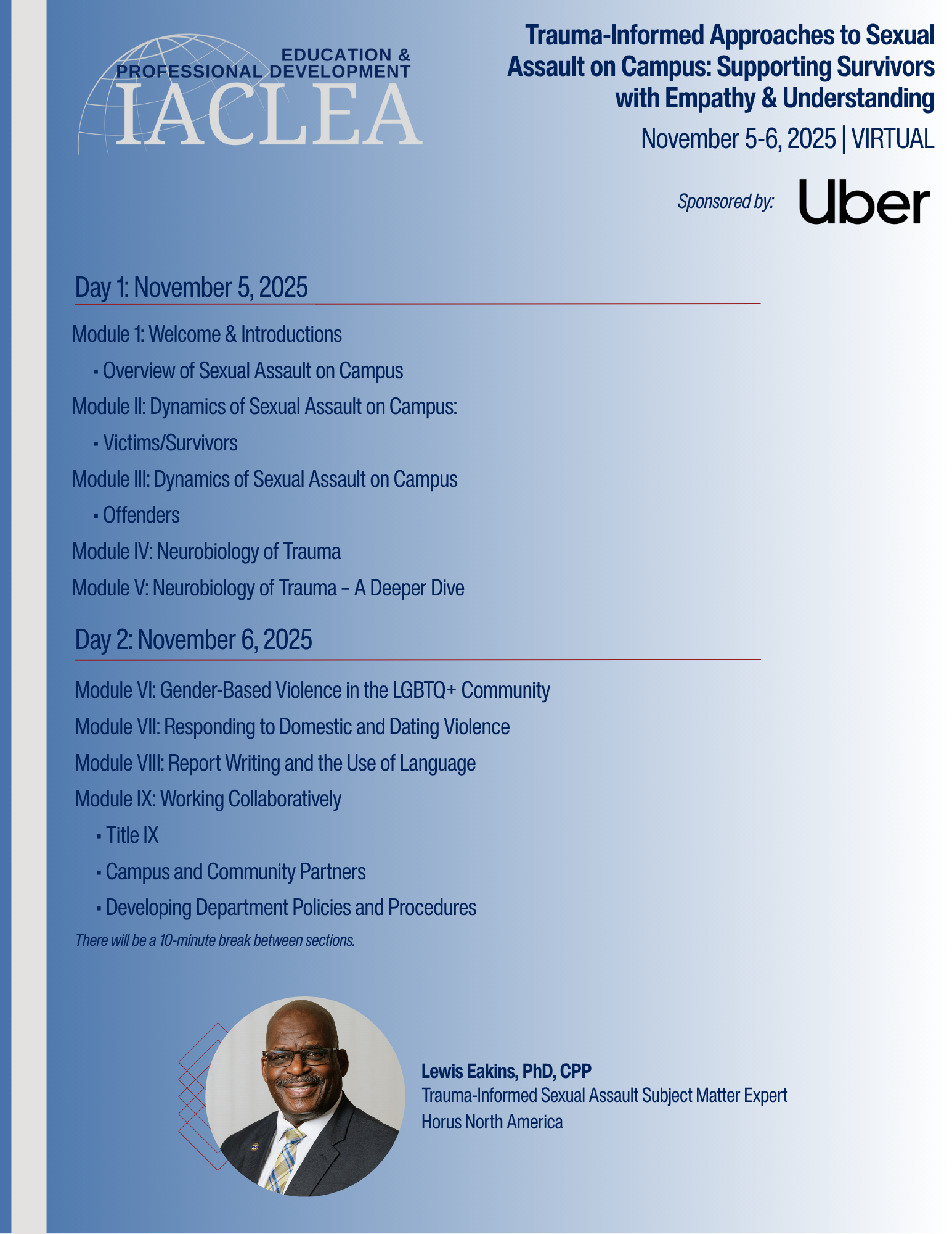 Gain essential skills in supporting survivors and conducting sensitive investigations. This training covers the neurobiology of trauma, effective interview techniques, and best practices for evidence collection. Learn how to collaborate with multidisciplinary teams and navigate Title IX and campus policies to create a safer, more supportive environment for all. Equip yourself with the knowledge to make a meaningful impact on your campus community.